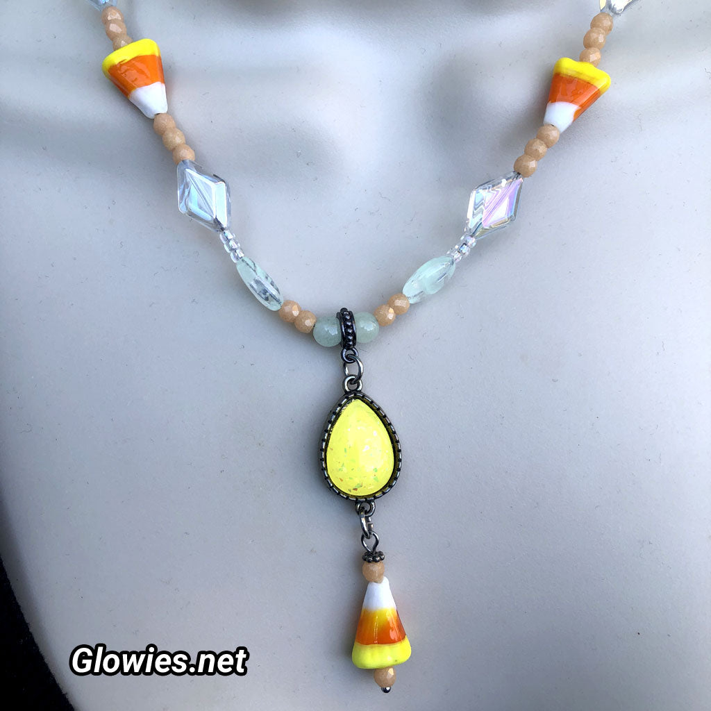 The glow in this candy corn Halloween necklace symbolizes light within darkness — a powerful contrast that perfectly captures the spirit of Halloween. While the Gothic elements lean into mystery, shadow, and the macabre, the glowing glass and handmade glow stone teardrop represent inner magic, resilience, and unseen energy. It’s like carrying a small haunted lantern close to your heart — a reminder that even in the darkest nights, something luminous lives within. That glow transforms the necklace from simply decorative into something almost talismanic.