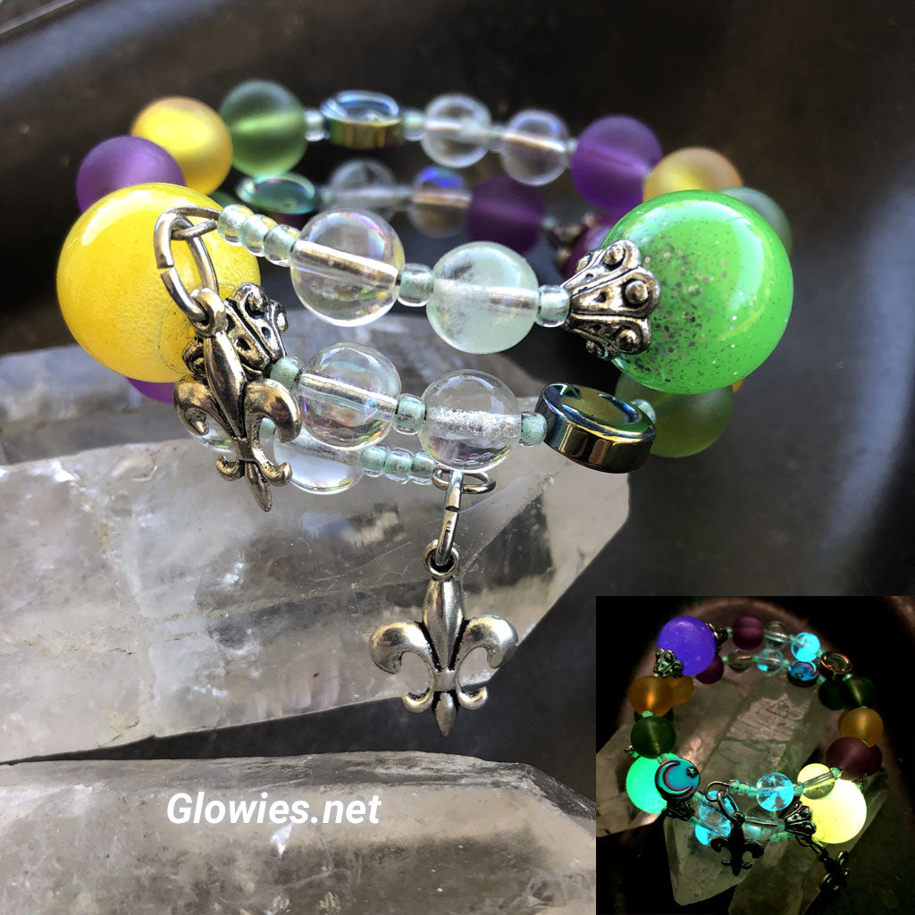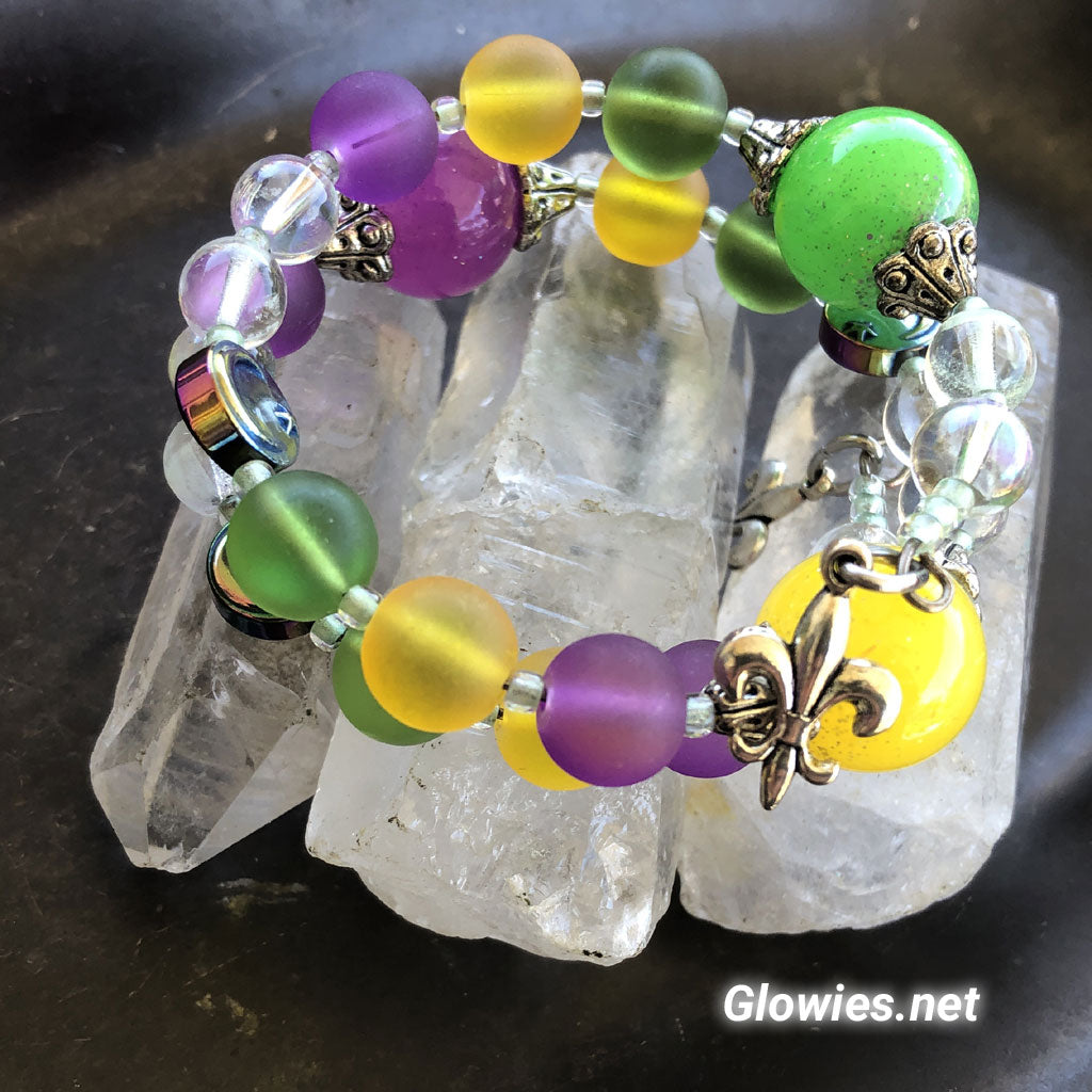 At each end of the bracelet rests a silver Fleur-de-lis, the iconic symbol of New Orleans, framing the design with unmistakable local pride. Large handmade glass orbs in rich Mardi Gras purple, gold, and green anchor the piece, paired with glow-in-the-dark glass that softly illuminates after dark—just like the city itself. Every detail is carefully wire-wrapped by hand, making each bracelet one of a kind, full of movement, light, and soul, and infused with the festive energy of Mardi Gras and the artistry of New Orleans. 💜💛💚