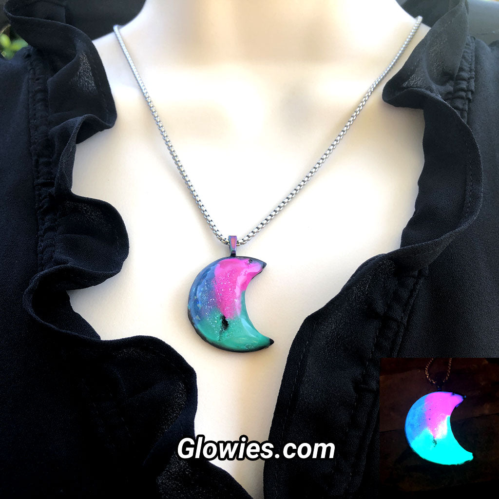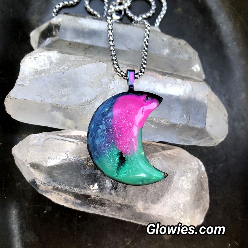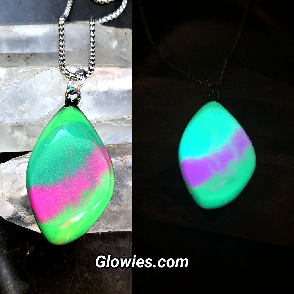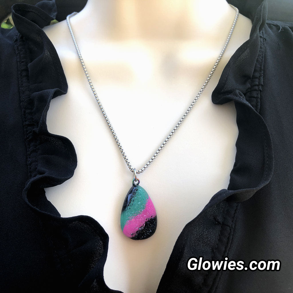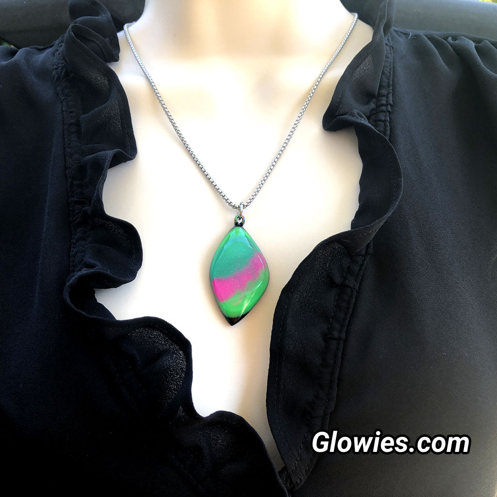 Free UV Lights subject to availability, if you need more than 1 for gifts order hereThe Necklace #1 captures the dancing light of the northern sky in a rhombus-shaped druzy that shifts through hues of pink, purple, blue, and black. Handmade by Monique Lula in her New Orleans studio, each stone glows with vivid ultraviolet energy—transforming into a radiant blue and violet aura after exposure to sunlight. The pendant hangs from a hypoallergenic link chain with a secure lobster clasp, glowing softly like twilight when the lights go out.