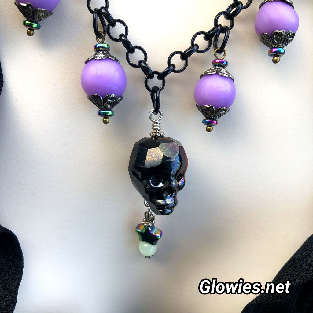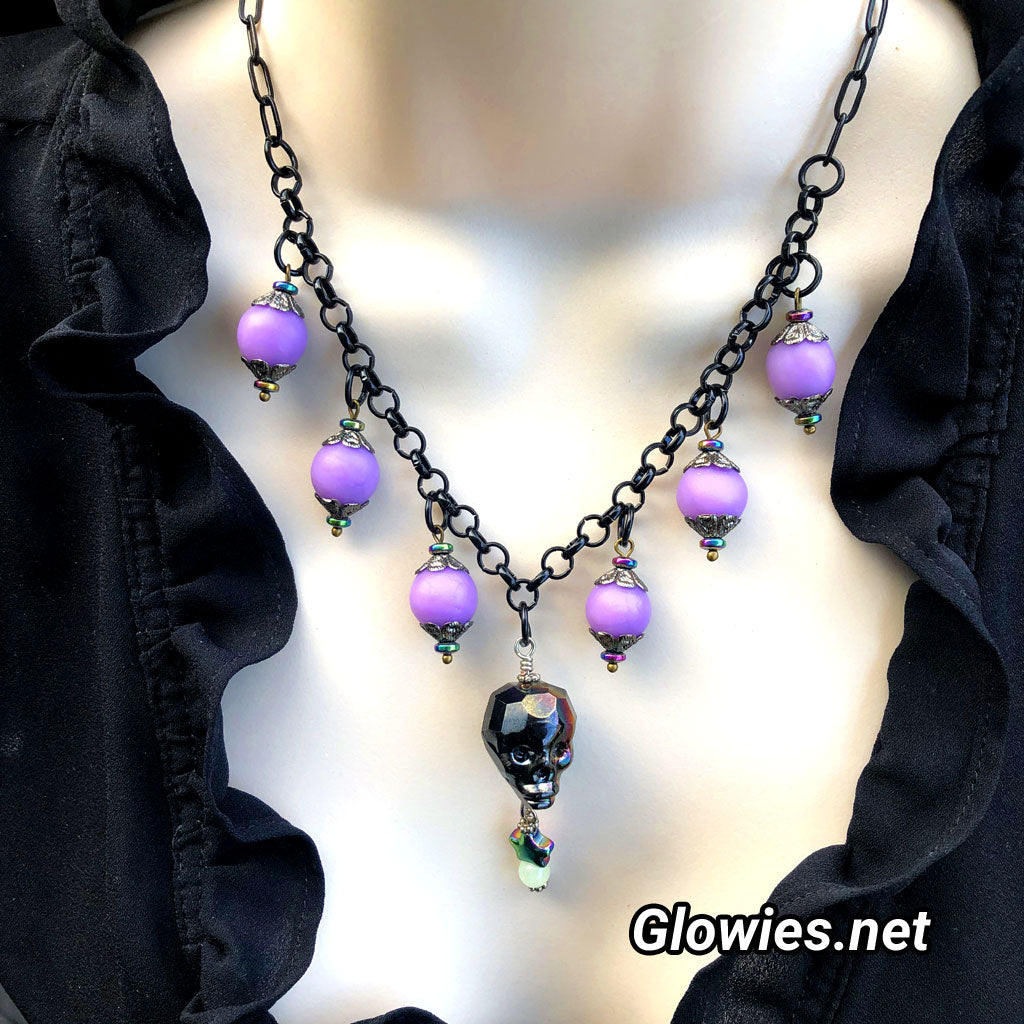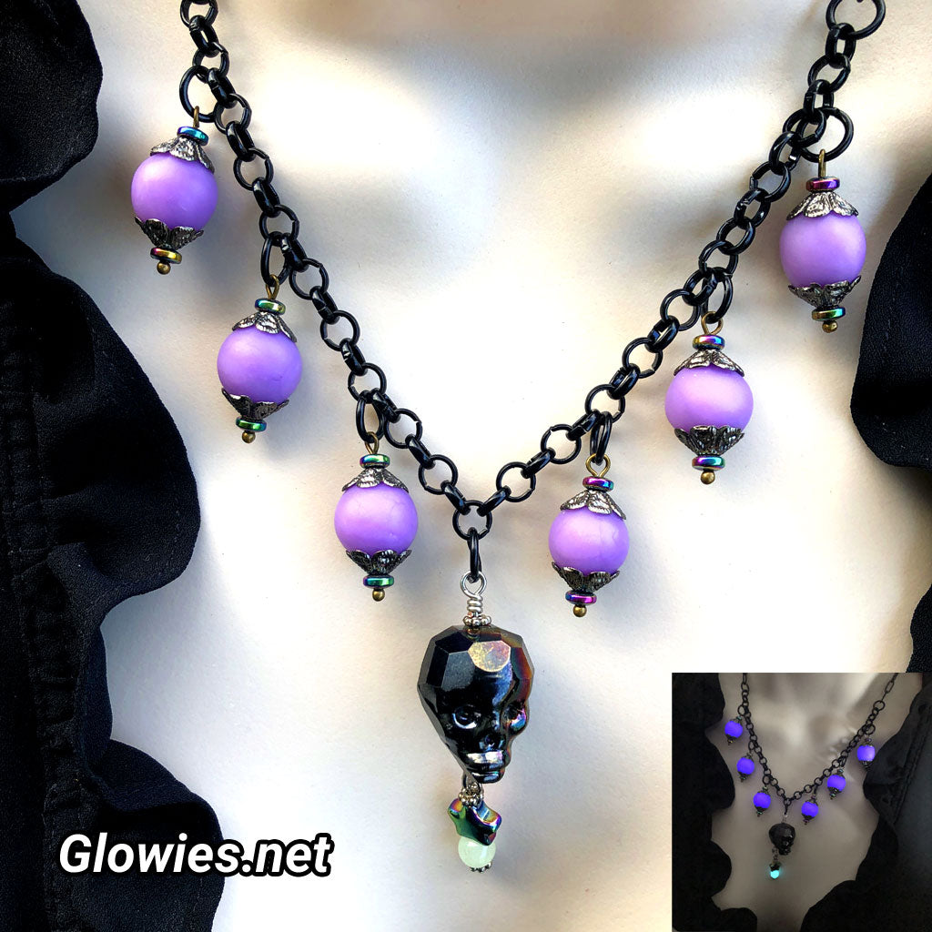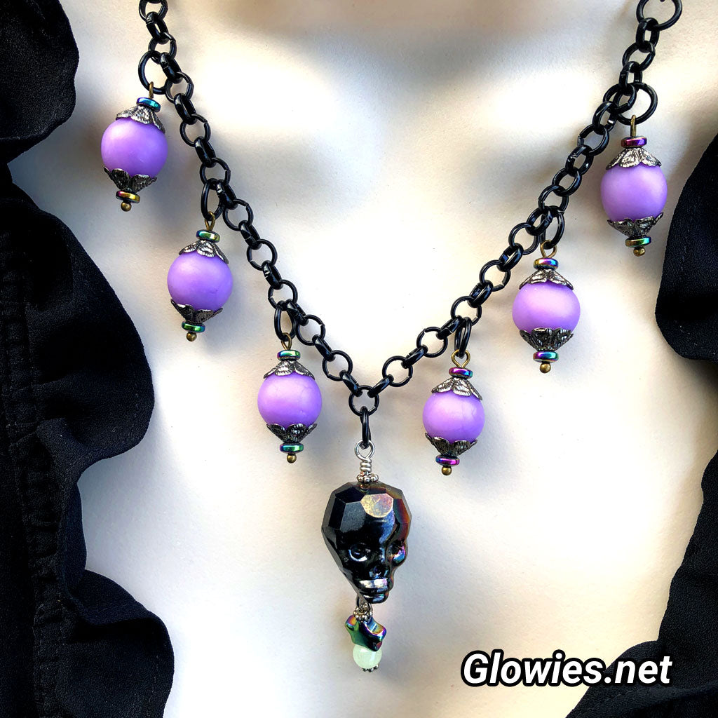 This Gothic Crystal Skull and Purple Glow Orb Necklace is a bold statement piece that blends mysticism, darkness, and luminous beauty. Six large handmade purple glow-in-the-dark orbs radiate an enchanting violet light, surrounding a smoky crystal skull centerpiece that commands attention. Finished with a dangling glow bead and star charm, the design feels ritualistic and celestial—perfectly balanced between gothic edge and magical elegance.