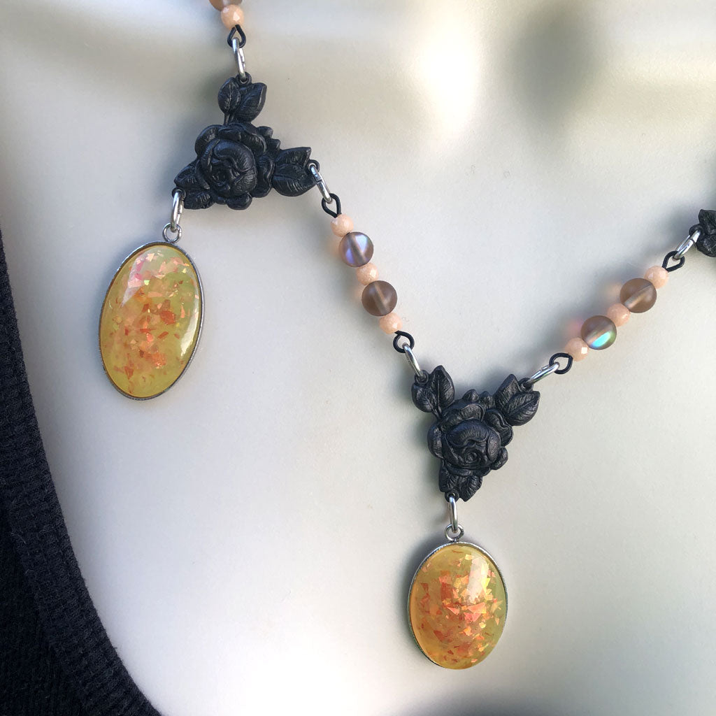 Vintage-style American-made rose-stamped connector embellishments frame each opal, adding old-world charm, while frosted glass beads and glow glass accents create layered texture and subtle sparkle. Every detail is thoughtfully chosen to balance gothic elegance with luminous beauty.