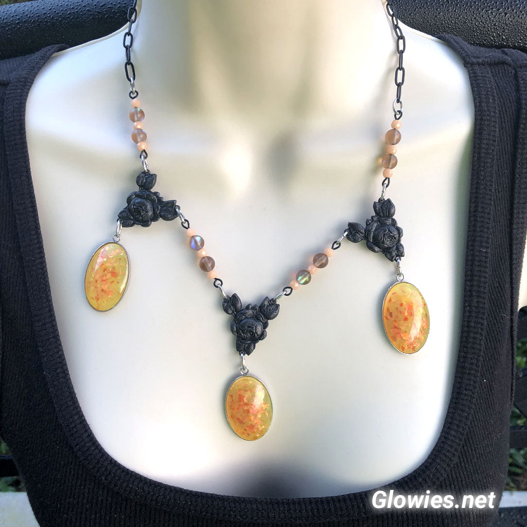 The Shadow Rose Ember Opal Necklace is a darkly romantic, handmade statement piece that glows with quiet magic. Featuring three oval glow-in-the-dark opal stones, this necklace comes alive after dusk, casting a soft ember-like light that feels both mysterious and ethereal.